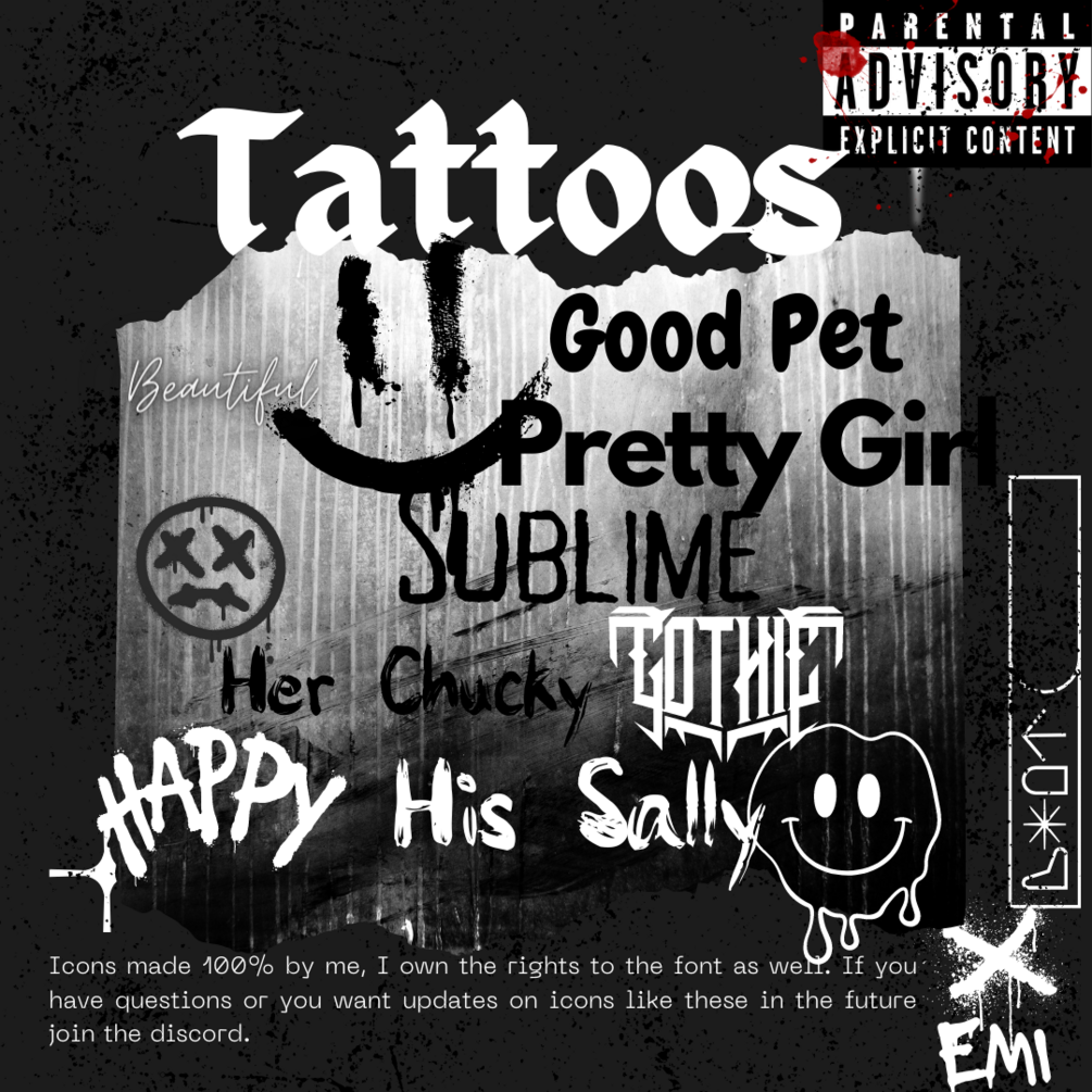 Over 70 Grunge and Cute tattoo sayings and images for you to create your own textures with! They come with transparent backgrounds and each image is its own png file for easy uploading and placing.